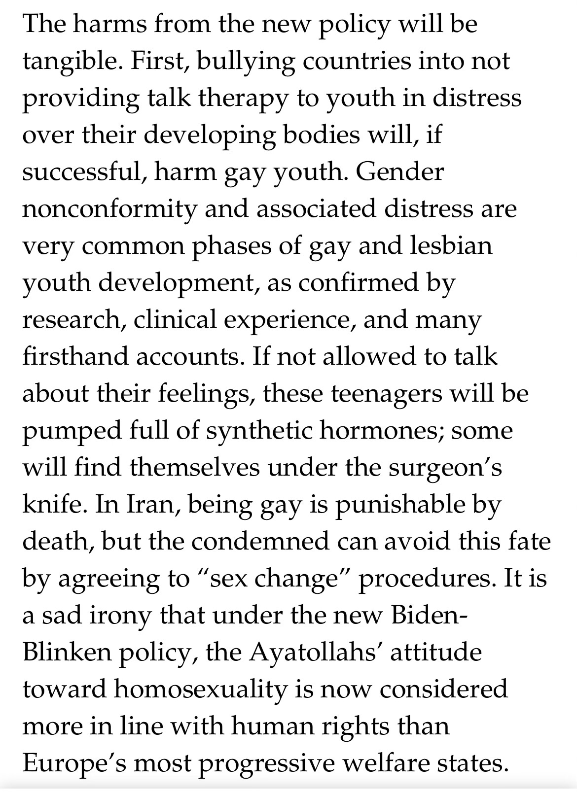 First, I want to talk about a recent City Journal article, “America, Exporter of the Gender Revolution,” written by Leor Sapir. It’s about the U.S. State Department’s plans to carry out President Biden’s Executive Order 14075, which instructs federal government agencies to do what they can to stop conversion therapy for “LGBTQI+” youth at home and abroad. Sapir notes that a State Department memo about the order includes simple “talk therapy” in its definition of conversion therapy, which is alarming, considering that the proper first response to children and adolescents who identify as transgender is often just that. The alternative—to immediately affirm a trans identity without properly exploring the possibility of past traumas and other comorbidities, as well as internalized homophobia—could mean we’re medicalizing individuals who do not need to be medicalized. The article contains the following passage: