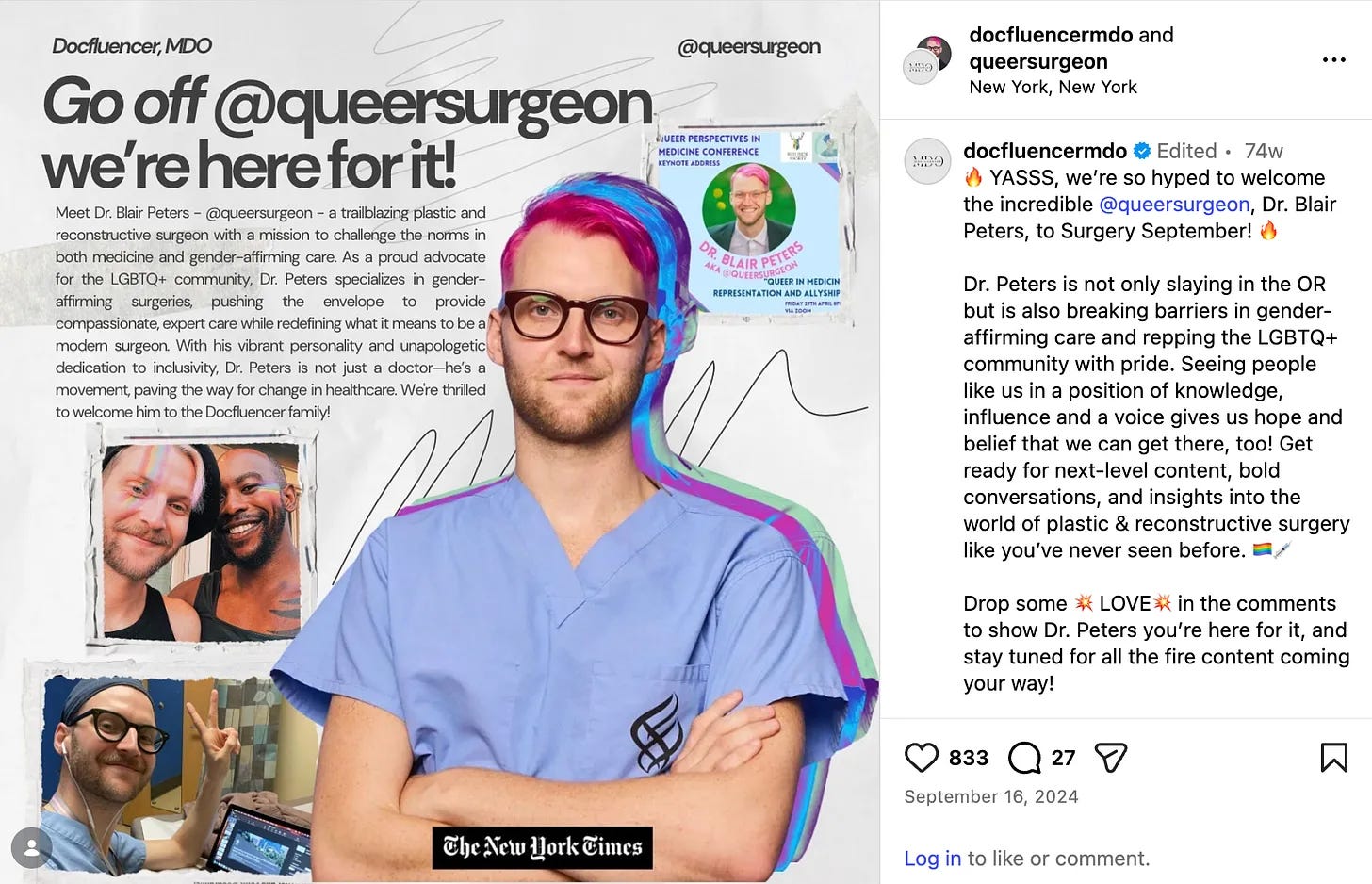 Since then, a group of gender surgeons have responded by launching a pressure campaign against the ASPS. Leading the group is Dr. Blair Peters (he/they), a plastic surgeon at Oregon Health & Science University (OHSU). On Instagram, where Peters has over 80,000 followers, Peters is known as “queersurgeon.”